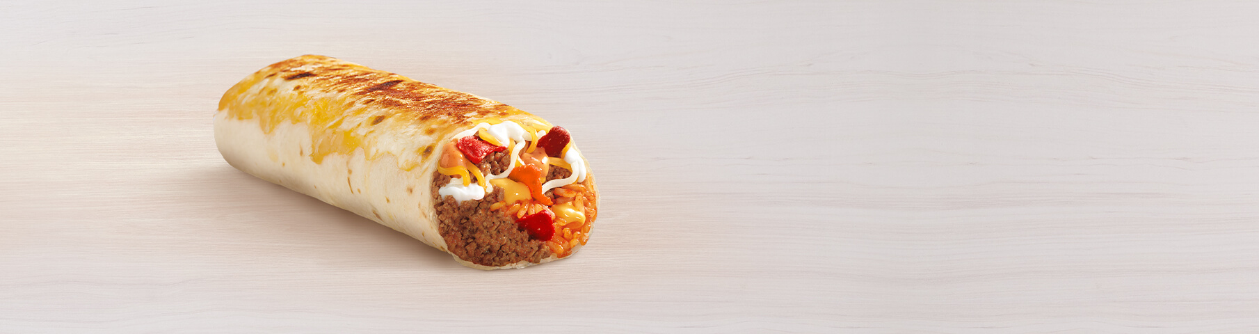 Double the seasoned beef*, nacho cheese sauce, seasoned rice, red strips, creamy chipotle sauce, reduced-fat sour cream, and three-cheese blend wrapped inside a warm flour tortilla, with even more three-cheese blend grilled on the top.