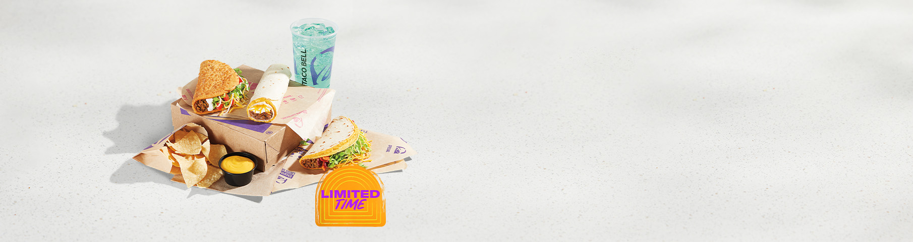 Includes a Seasoned Beef Chalupa Supreme®, a Beefy 5-Layer Burrito, a Double Stacked Taco, chips & Nacho Cheese sauce, and a medium fountain drink.