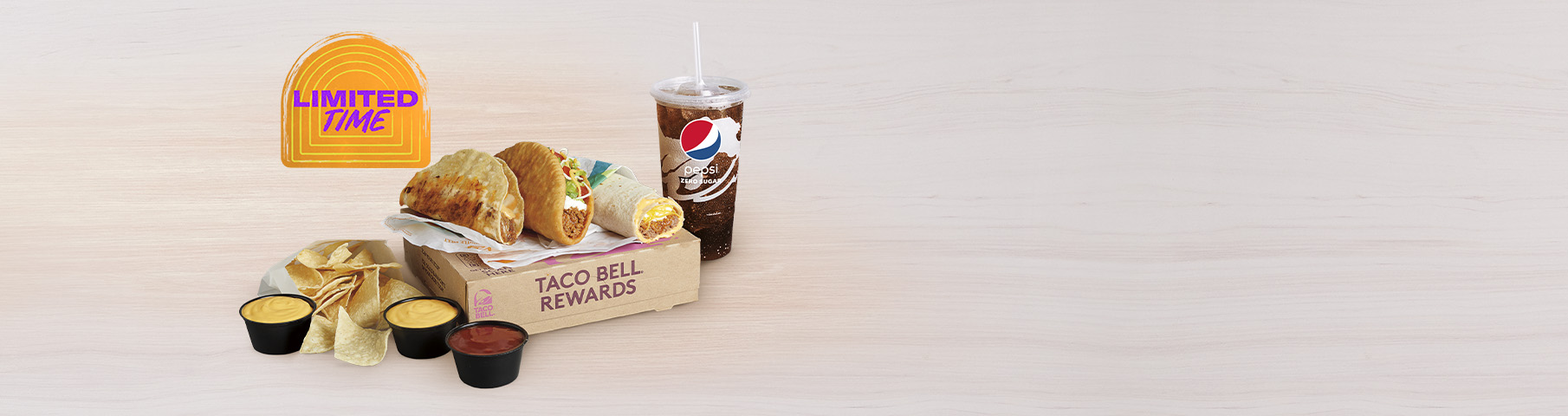 Includes a Chalupa Supreme, a Beefy 5-Layer Burrito, a shredded beef Grilled Cheese Dipping Taco with Nacho Cheese sauce and Red sauce to dip, chips & Nacho Cheese sauce, and a medium fountain drink.