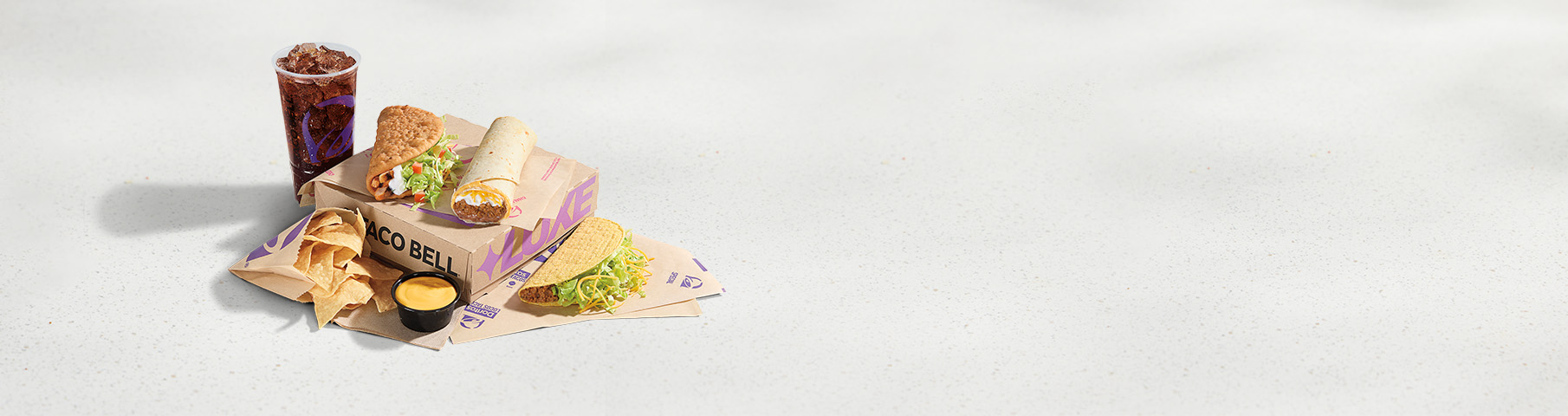 Chicken Chalupa Supreme, Beefy 5-Layer Burrito, Crunchy Taco, Twists, medium drink.