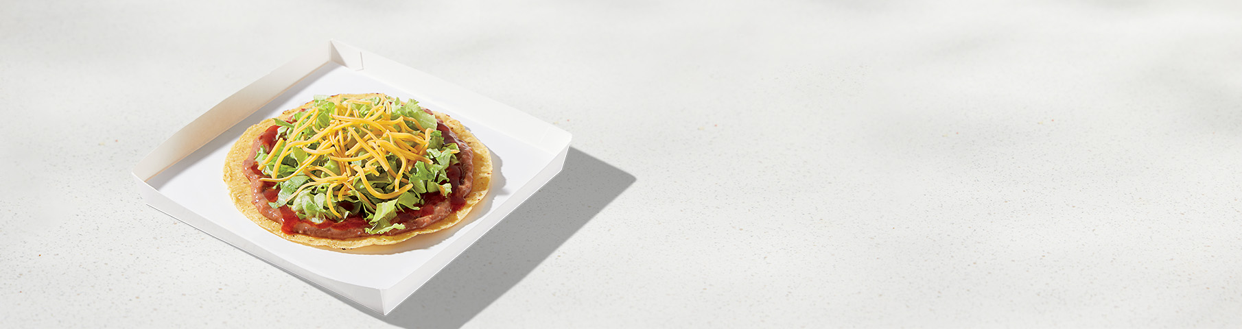 Crispy tostada shell layered with savory refried beans, tangy red sauce, crispy lettuce and shredded cheese