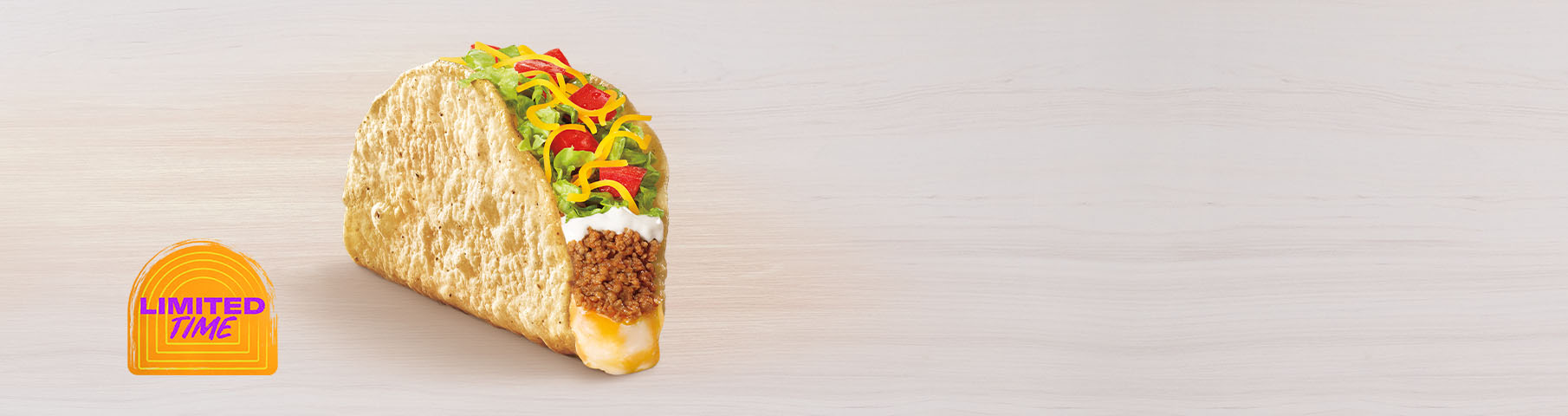 A white-corn shell, freshly fried daily, with a melted layer of our three-cheese blend and nacho cheese sauce and filled with seasoned beef, reduced-fat sour cream, lettuce, tomatoes and real shredded cheddar cheese.