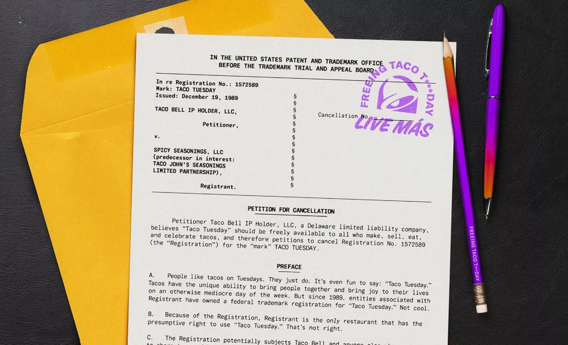 Taco Bell is rallying taco enthusiasts to support their efforts to cancel the Taco Tuesday trademark registrations IRVINE, Calif. (May 22, 2023) – Nearly one week in, Taco Bell’s journey to liberate the phrase “Taco Tuesday” from its trademarked status continues so that small businesses, independent restaurants, mom-and-pop taco joints, food trucks and taco lovers alike can freely use the common term for the benefit of all. Today, global icon and longtime “Taco Tuesday” enthusiast, LeBron James, shares his support for Taco Bell’s effort to cancel the registered trademark, which has threatened companies, large and small, that use the phrase since 1989. Taco Bell filed its legal petitions to cancel the federal trademark registrations for “Taco Tuesday” via the USPTO Trademark Trial and Appeal Board on May 16, 2023.“ ‘Taco Tuesday’ is a tradition that everyone should be able to celebrate. All restaurants, all families, all businesses – everybody,” says LeBron James. “‘Taco Tuesdays’ create opportunities that bring people together in so many ways, and it’s a celebration that nobody should own.” “Our passion for liberating ‘Taco Tuesday’ is fueled by the community of taco enthusiasts that turned two simple words into a cultural phenomenon,” says Taco Bell’s Chief Marketing Officer, Taylor Montgomery. “To see the support and excitement in response to our efforts to free ‘Taco Tuesday’ for everyone is not something we take lightly. And, much like Taco Tuesday itself, it’s better when shared. ”Airing beginning May 22, LeBron James will star in an ad titled “Taco Bleep,” highlighting the absurdity of “Taco Tuesday” being “trademarked” and encouraging the taco community to join together in support of the liberation movement. There is still time to support Taco Bell’s liberation efforts in the name of taco culture by signing the Freeing Taco Tuesday petition at change.org/freeingtacotuesday. For additional information and upcoming ways to participate in the liberation journey, visit www.tacobell.com/freeing-taco-tuesday and follow along on Taco Bell social channels.Find media assets HERE About Taco Bell Corp. For more information about Taco Bell, visit our website at www.TacoBell.com, our Newsroom at www.TacoBell.com/news or www.TacoBell.com/popular-links. You can also stay up to date on all things Taco Bell by following us on LinkedIn, TikTok, Taco Bell’s Twitter, Taco Bell News’ Twitter, Instagram, Facebook, and subscribing to our YouTube channel.