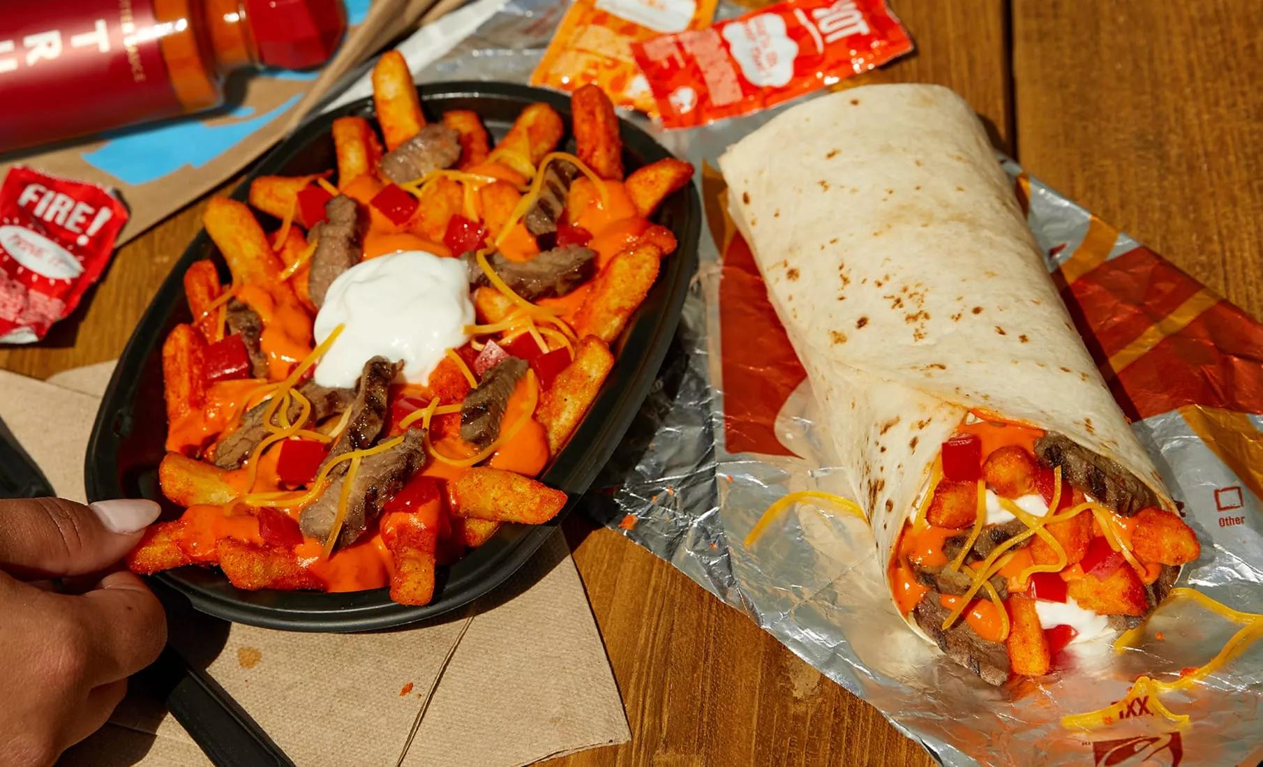 Loaded TRUFF Nacho Fries feature boldly seasoned fries topped with steak, TRUFF Nacho Cheese Sauce, shredded cheddar cheese, tomato and reduced-fat sour cream. The Loaded TRUFF Fries Burrito includes all of the ingredients of the Loaded TRUFF Nacho Fries wrapped in a warm tortilla.