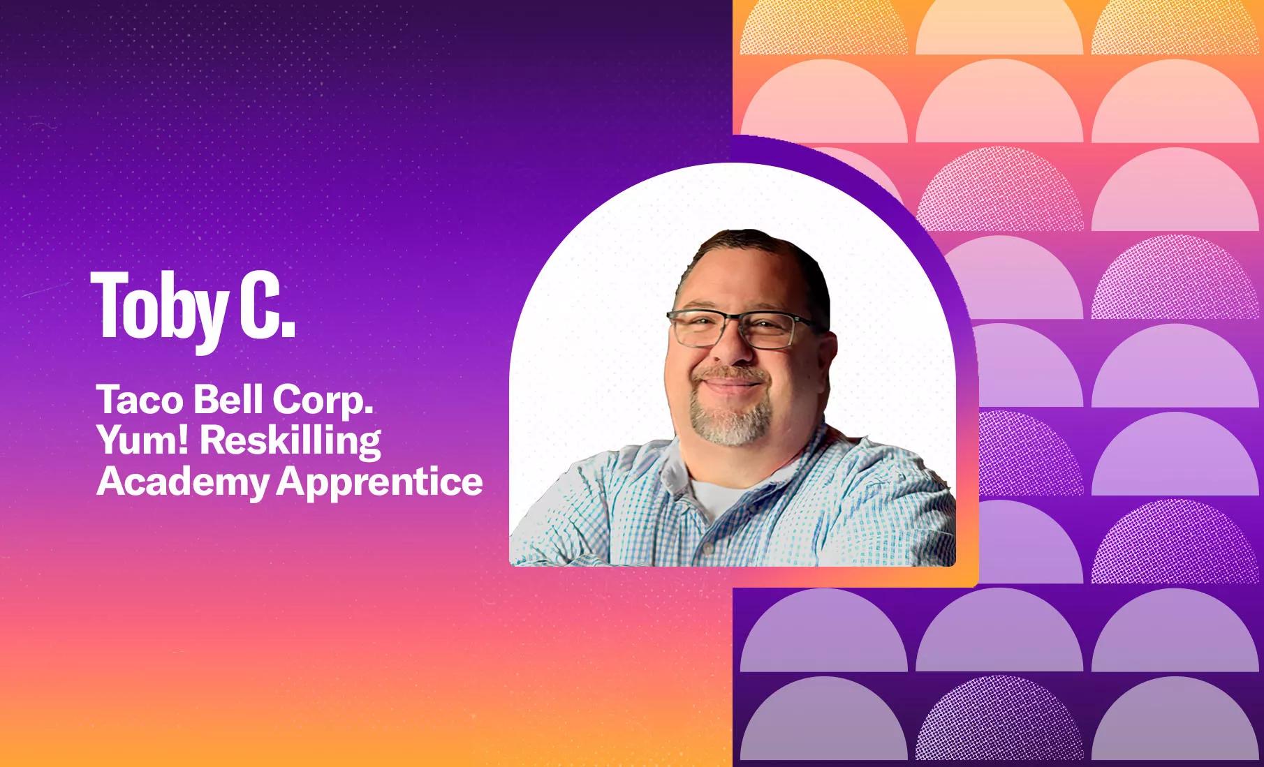 Five years later, Toby is still working for the brand and was encouraged to apply for Taco Bell’s parent company’s apprenticeship pilot program, the Yum! Reskilling Academy. He was accepted as a system engineer apprentice.